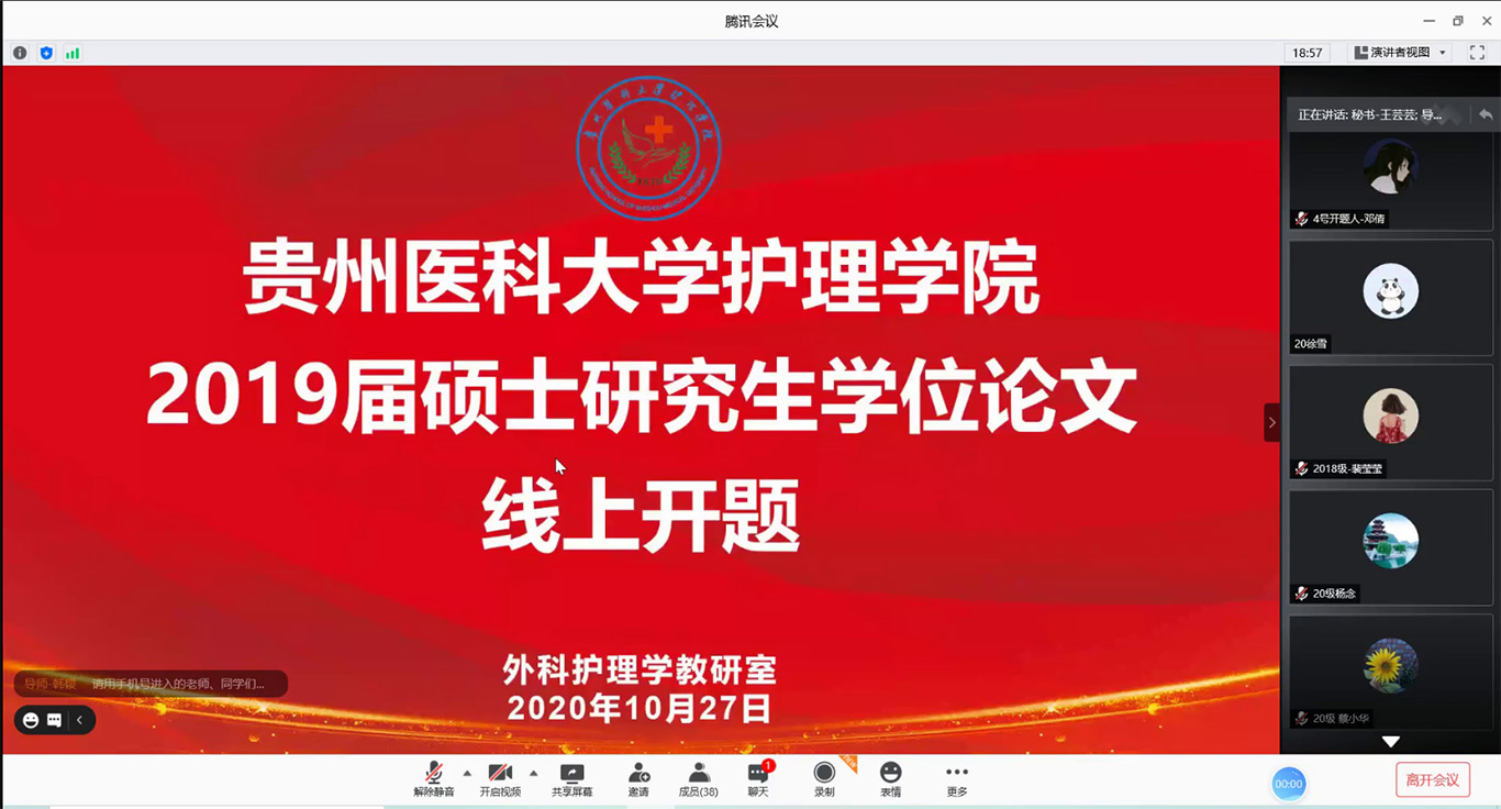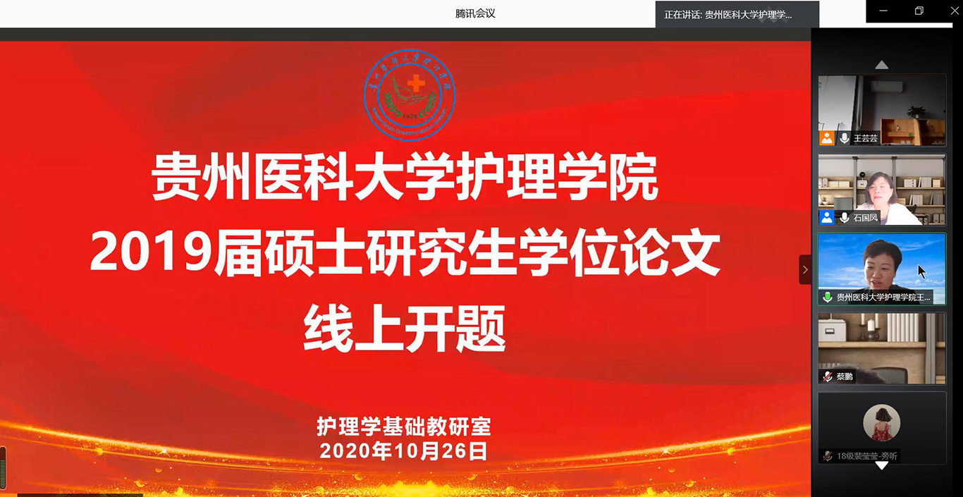 10月26日-27日,中国十大娱乐赌博城网址2019级硕士研究生第一批集中开题通过腾讯会议平台在线进行,护理学基础教研室3名研究生和外科护理学教研室4名研究生