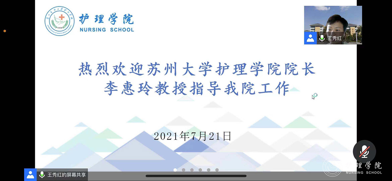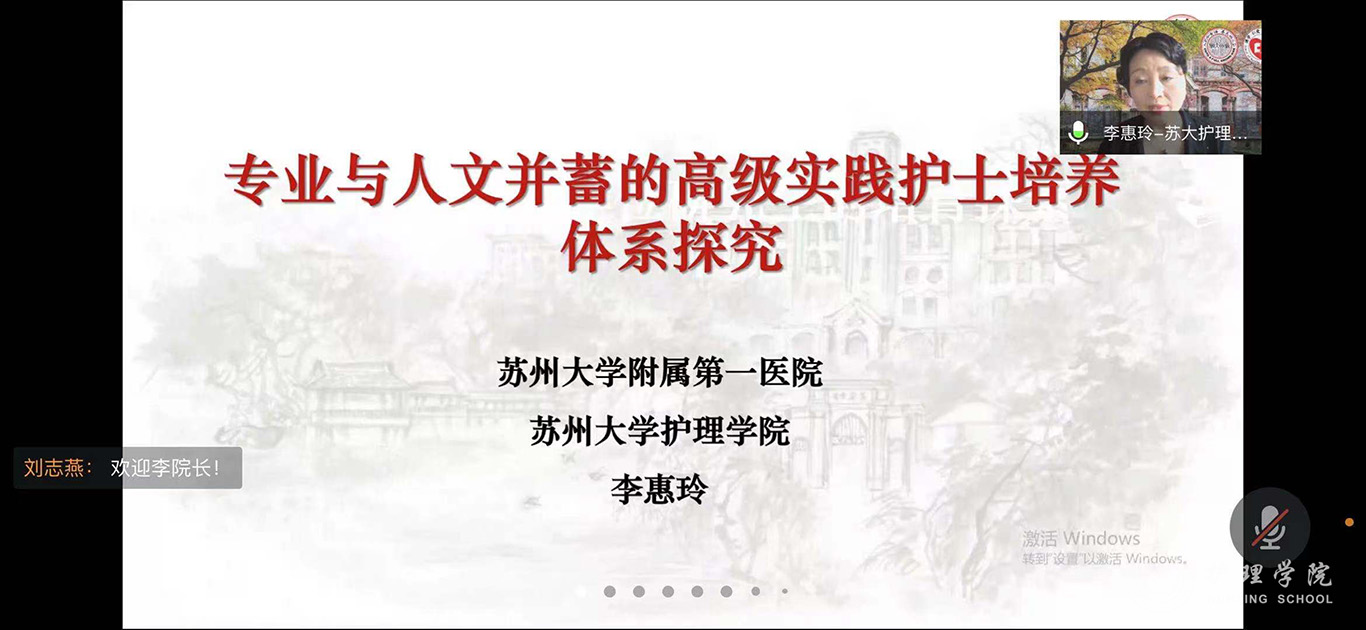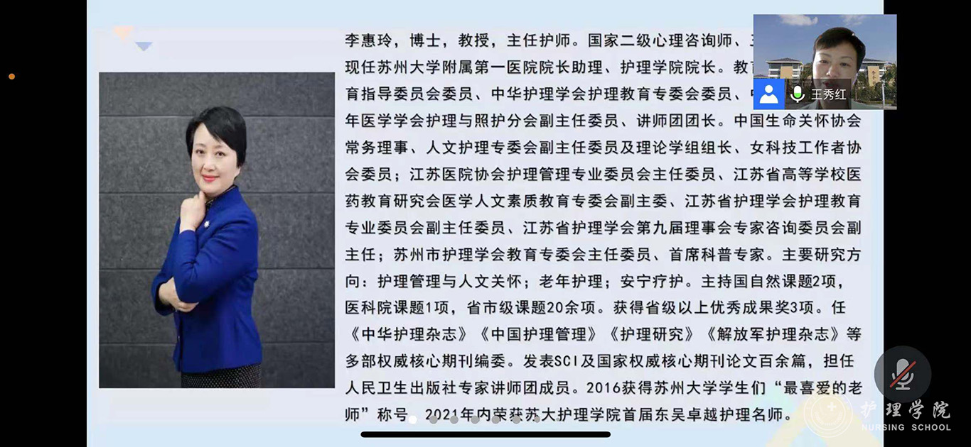 为进一步推进我校护理学科内涵建设,提升我校护理专硕研究生培养质量,7月21日,中国十大娱乐赌博城网址特邀苏州大学附属第一医院院长助理、中国十大娱乐赌博城网址院长李惠玲教授为师生开展了题为《专业与人文并蓄的高级实践护士培养体系探究》的专题讲座,并进行指导。讲座和指导通过腾讯会议进行,中国十大娱乐赌博城网址党委委员、副院长刘志燕、附属医院护理部副主任蔡鹏、顾颖及研究生导师、副导师、学院和附院相关教师及研究生共计110余人参加,中国十大娱乐赌博城网址党委委员、副院长王秀红主持活动。